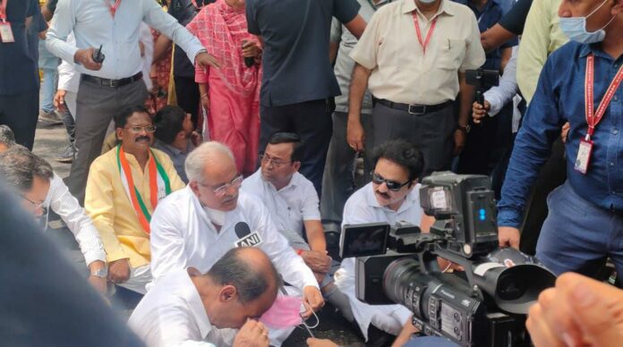 दिल्ली में कांग्रेस मुख्यालय से ED कार्यालय की ओर प्रदर्शन करने जा रहे छत्तीसगढ़ के मुख्यमंत्री भूपेश बघेल को पुलिस ने रोक लिया। मुख्यमंत्री सड़क पर बैठकर धरना देने लगे तो उन्हें वहां से उठाकर वापस भेज दिया गया। वहीं से स्वास्थ्य मंत्री टीएस सिंहदेव, प्रदेश अध्यक्ष मोहन मरकाम, विधायक शैलेश पाण्डेय, युवा कांग्रेस के सुबोध हरितवाल, पिछड़ा वर्ग प्रकोष्ठ के चौलेश्वर चंद्राकर आदि को गिरफ्तार कर बसंत कुंज थाने में बिठा दिया गया है। मंत्री अमरजीत भगत को नरेला थाने ले जाया गया है।