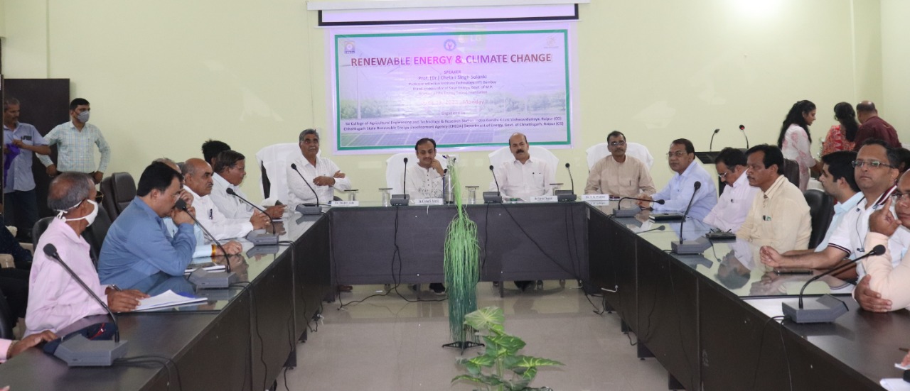 इंदिरा गांधी कृषि विश्वविद्यालय के स्वामी विवेकानंद कृषि अभियांत्रिकी एवं प्रौद्योगिकी महाविद्यालय, रायपुर में छत्तीसगढ़ राज्य अक्षय ऊर्जा विकास एजंेसी एवं ऊर्जा विभाग छत्तीसगढ़ शासन के सहयोग से ‘‘अक्षय ऊर्जा एवं जलवायु परिवर्तन’’ विषय पर तकनीकी वार्ता का आयोजन किया गया। कार्यक्रम में मुख्य अतिथि के रूप में इंदिरा गांधी कृषि विश्वविद्यालय के कुलपति डॉ. गिरीश चंदल उपस्थित थे। तकनीकी वार्ता में मुख्य वक्ता के रूप में भारतीय प्रौद्योगिकी संस्थान, मुम्बई के प्राध्यापक एवं स्वराजा फाउंडेशन के संस्थापक (डॉ.) चेतन सिंह सोलंकी ने विद्यर्थियों को संबोधित किया। मुख्य अतिथि कुलपति डॉ. गिरीश चंदेल ने तथ्यों के आधार पर कार्ब डाई ऑक्साईड से होने वाली हानि की ओर प्रकाश डालते हुए कहा कि आजकल दर्पण आधारित तकनीक से तापक्रम में कमी की जा रही है, किन्तु वनों का कटाव बढ़ने, जनसंख्या की वृद्धि दर बढ़ने और उत्पादन की वृद्धि दर कम होने से सामन्यजस्य स्थापित नहीं हो पा रहा है, इसलिए अब सौर ऊर्जा की ओर मुड़कर इसका लाभ लेना चाहिए।
