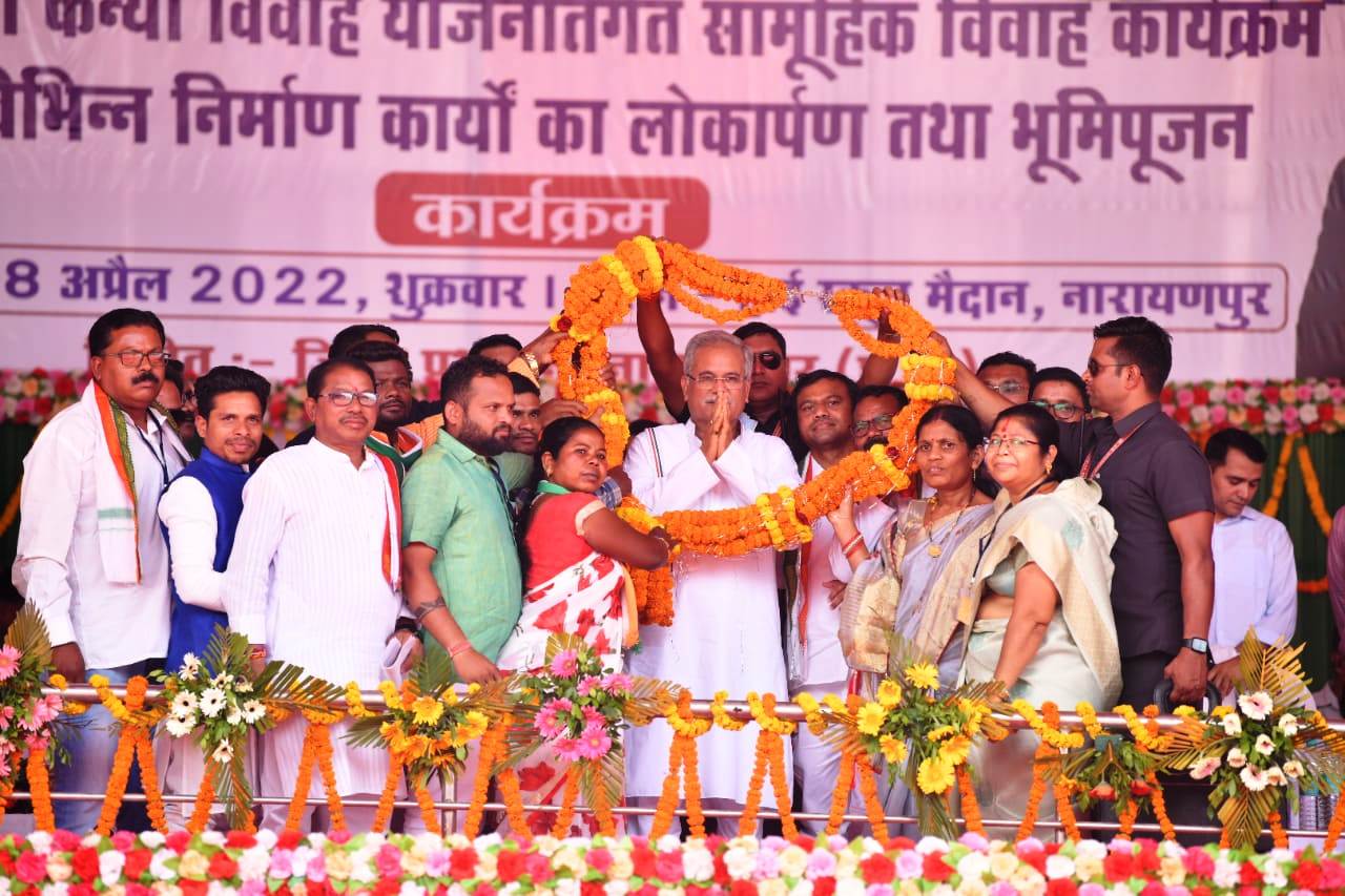 इस अवसर पर मुख्यमंत्री ने कहा कि उन्होंने आज यहां मुख्यमंत्री कन्या विवाह योजना के तहत सामूहिक वैवाहिक कार्यक्रम में शामिल होकर 251 नव दंपत्तियों को सुखमय जीवन का आशीर्वाद दिया है। उन्होंने कहा कि नारायणपुर के विकास को गति प्रदान करने के लिए यहां लगभग 128 करोड़ रुपए के विभिन्न कार्यों का भूमिपूजन और लोकार्पण किया गया है। मुख्यमंत्री श्री बघेल ने कहा कि अब तक इन गांवों के 788 किसानों को मसाहती खसरा पुस्तिका देकर उनके जीवन में बदलाव की शुरुआत की जा चुकी है। आज के इस कार्यक्रम में भी 500 से अधिक किसानों को मसाहती खसरा पुस्तिका प्रदान की जा रही है। अब अबूझमाड़ के हमारे किसान भाई भी राजीव गांधी किसान न्याय योजना का लाभ ले रहे हैं। मनरेगा के अंतर्गत अब वे भी अपनी भूमि का समतलीकरण करा सकते हैं। अपने खेतों में डबरी निर्माण कराकर मछली पालन भी कर सकते हैं। सौर सुजला योजना का लाभ उठाकर अपने खेतों के सिंचाई की व्यवस्था कर सकते हैं। क्रेडिट कार्ड का अब वे भी लाभ उठा सकते हैं।
