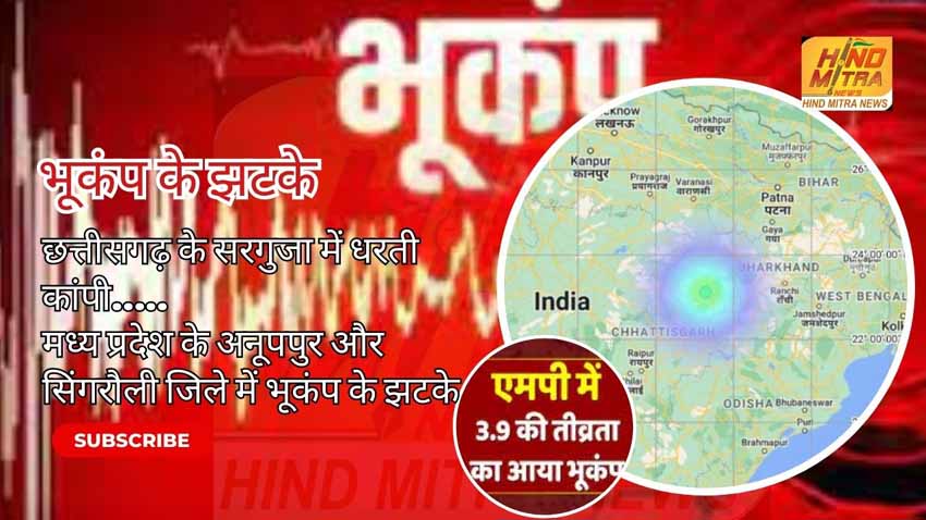 सरगुजा | भूकंप का केंद्र छत्तीसगढ़ का सरगुजा रहा। जानकारी के अनुसार सोमवार रात आठ बजकर 6 मिनट पर छत्तीसगढ़ के सरगुजा में धरती कांपी थी। 3.9 तीव्रता के झटके लगे हैं। मध्य प्रदेश के अनूपपुर और सिंगरौली जिले में सोमवार रात करीब साढ़े आठ बजे भूकंप के झटके महसूस किए हैं। रिएक्टर स्केल पर इसकी तीव्रता 3.9 दर्ज की गई। भूकंप का हाइपोसेंटर 11 किलोमीटर गहराई पर रहा। इसका असर मध्यप्रदेश के अनूपपुर और सिंगरौली में भी रहा। हलचल महसूस होते ही लोग घरों से बाहर निकल आए ।