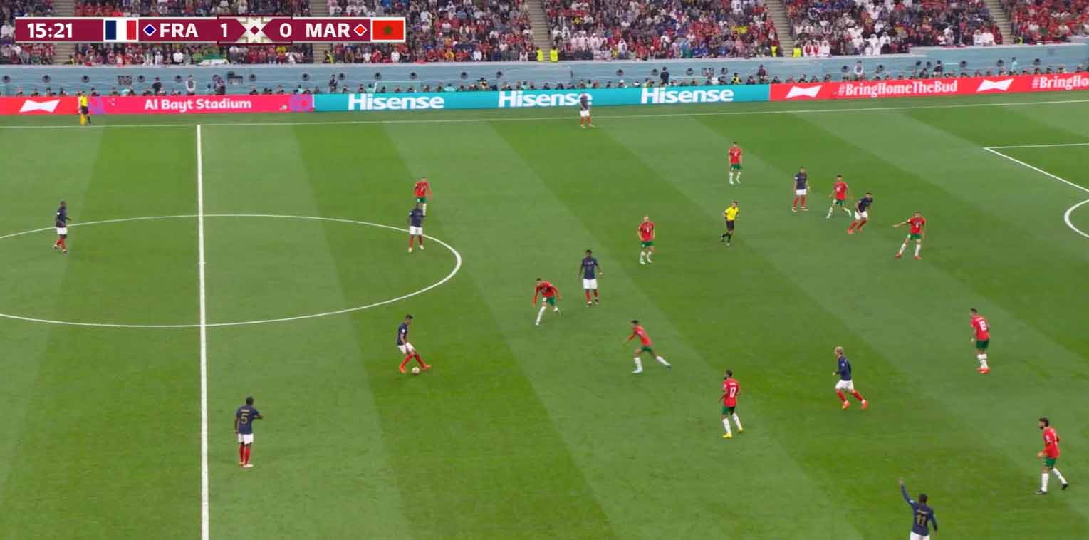 फ्रांस ने पांचवें मिनट में ही बढ़त हासिल कर ली है। थियो हर्नांडेज ने टीम के लिए पहला गोल किया। हर्नांडेज ने मोरक्को के गोलकीपर बुनौ को नजदीक से छकाते हुए गोल दाग दिया। मोरक्को की टीम इस विश्व कप में पहली बार किसी मैच में 0-1 से पीछे हुई है।